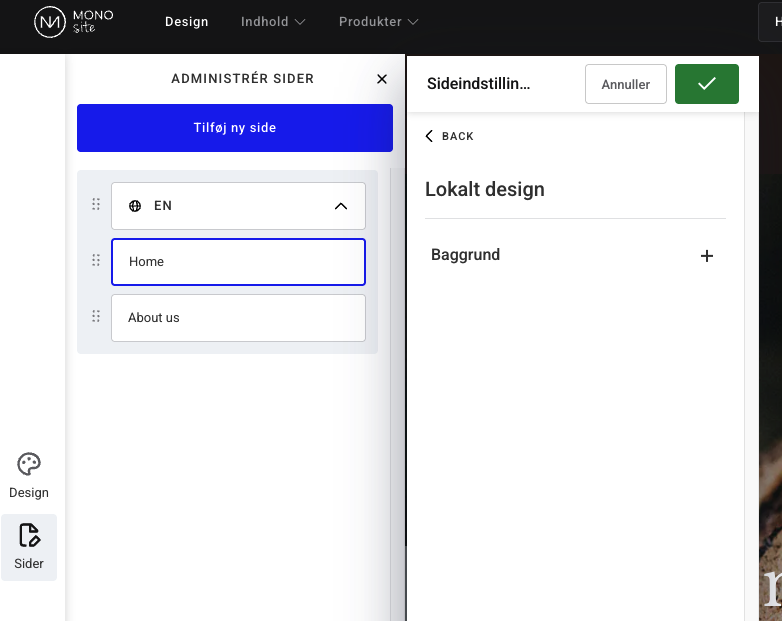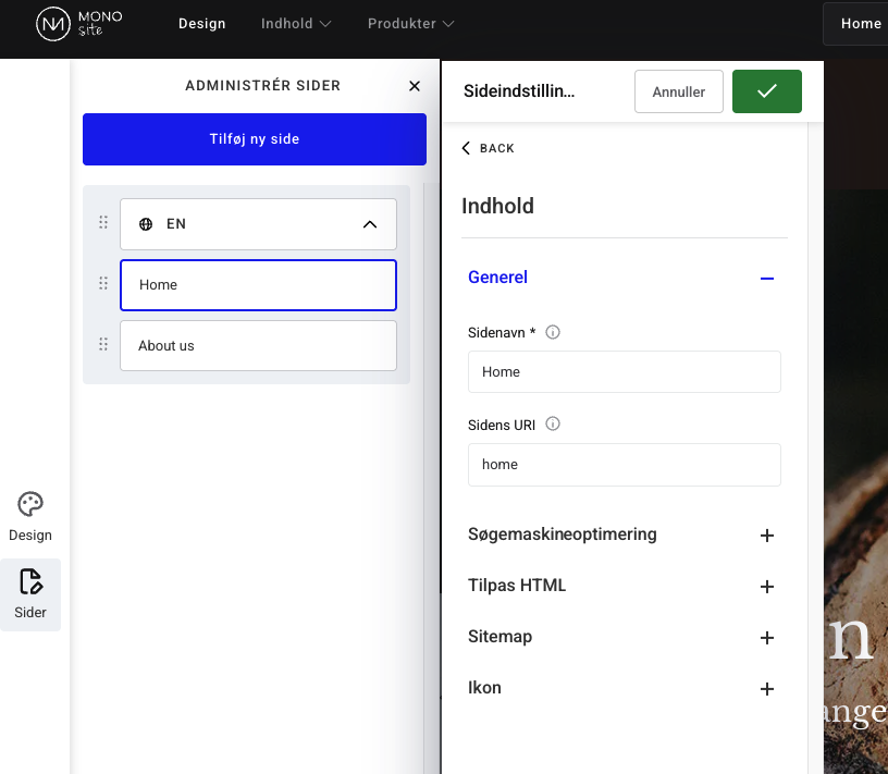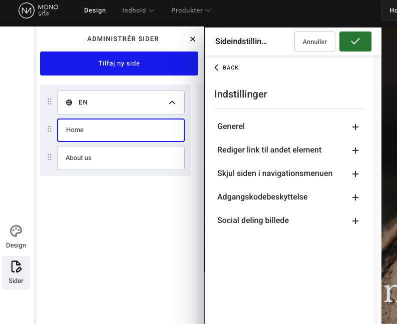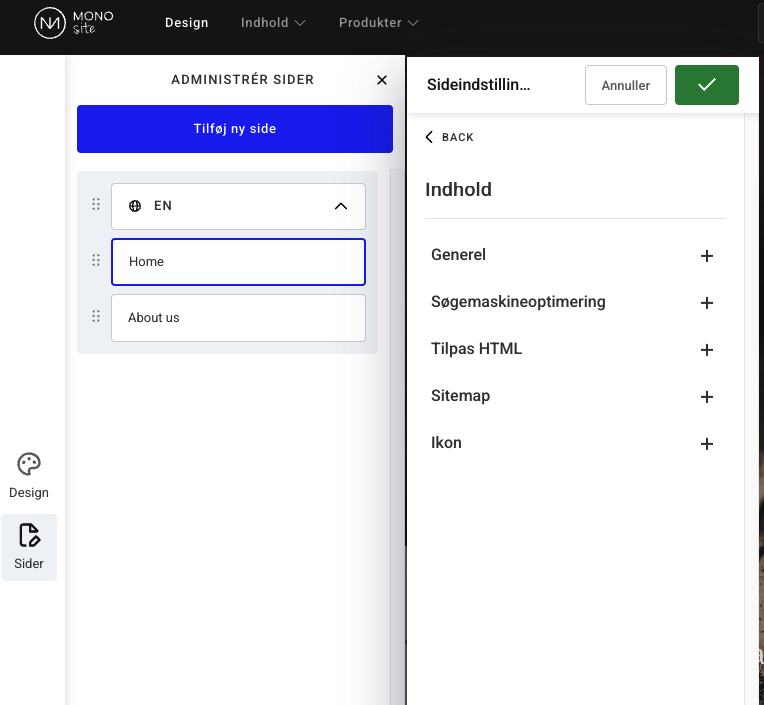 Under sideindstillinger kan du redigere al den information, der har med dine sider at gøre, for eksempel SEO og 301 redirects. Naviger til sideindstillingerne ved at klikke på sider i menuen ude i venstre side, vælg tandhjulsikonet på den side du vil ændre, og klik redigér indstillinger.