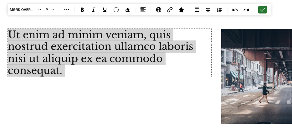 Teksteditoren giver dig masser af måder at style og formatere teksten på din hjemmeside. Du kan definere et design for hver af dine teksttyper (Mørk overskrift, mørk spot tekst, Lys overskrift, lys indledning, osv) i menuen Design til venstre.