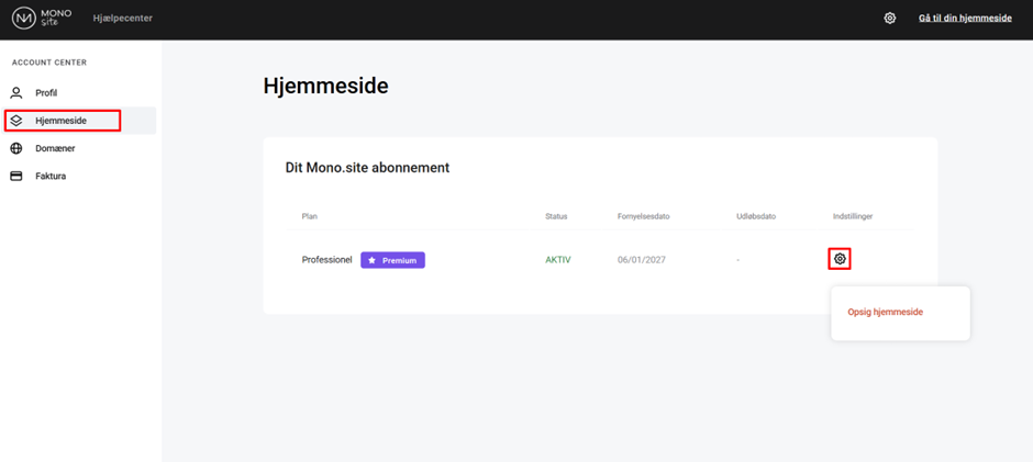 Under Hjemmeside fanen kan du se status på dit nuværende abonnement, du kan også Opsige eller Opgradere abonnementet på samme side.