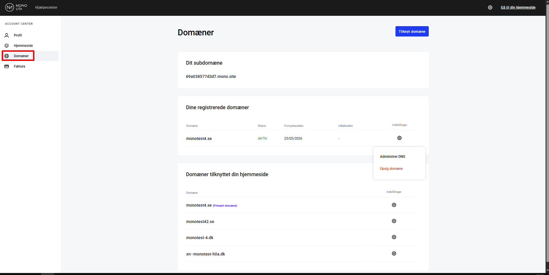 Under Domæner kan du nu se og administere de domæner tilknyttet din side. Hvis domænet er registreret hos Mono vil det også være muligt at Administrere DNS opsætningen via denne side.